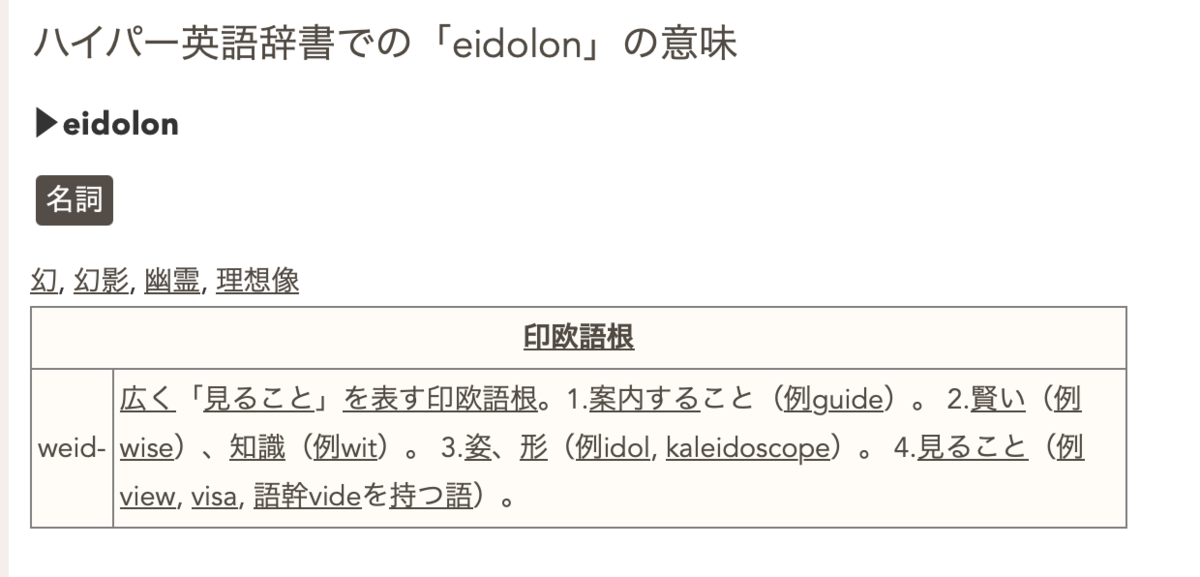この「eidōlon」は、「形、姿、類似」を意味する「eidos」から派生しています。